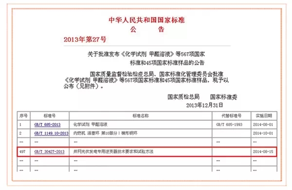 由陽光電源主持制定《GB/T 30427-2013 并網(wǎng)光伏發(fā)電專用逆變器技術(shù)要求和試驗(yàn)方法》于2014年8月15日正式實(shí)施。標(biāo)準(zhǔn)對(duì)光伏發(fā)電系統(tǒng)之關(guān)鍵部件——光伏并網(wǎng)逆變器的技術(shù)要求、試驗(yàn)方法、檢驗(yàn)規(guī)則等作出了明確要求和規(guī)定,為光伏逆變器的設(shè)計(jì)、生產(chǎn)、檢測(cè)和認(rèn)證等提供了權(quán)威的依據(jù)。