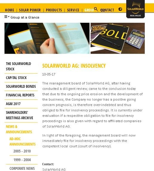 路透社消息,5月10日SolarWorld AG在德國申請破產(chǎn),目前還不清楚其美國子公司是否也將提交。 德國太陽能制造商SolarWorldAG資不抵債,向地方法院申請破產(chǎn),目前還不清楚公司的美國子公司將命運如何。在5月10發(fā)布的簡短聲明中,SolarWorld公司表示,無法履行其債務(wù)義務(wù),目前