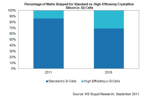 根據(jù)HIS公司iSuppli的最新光伏市場(chǎng)分析報(bào)告,隨著太陽(yáng)能行業(yè)價(jià)格和利潤(rùn)的惡性循環(huán)式發(fā)展,高效晶硅光伏電池的市場(chǎng)份額在2015年增加一倍。