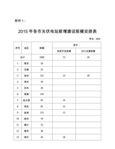 各市發(fā)展改革委: 根據(jù)國家光伏發(fā)電有關(guān)管理規(guī)定和《國家能源局關(guān)于下達(dá)2015年光伏發(fā)電建設(shè)實施方案的通知》(國能新能〔2015〕73號)、《江蘇省促進(jìn)光伏產(chǎn)業(yè)健康發(fā)展實施辦法》(蘇政辦發(fā)〔2014〕19號)和《省發(fā)展改革委關(guān)于推進(jìn)分布式光伏發(fā)電健康發(fā)展的意見》(蘇發(fā)改能源發(fā)〔2014〕1131號)等要求,在充分考慮各地2014年度光伏發(fā)電新增建設(shè)規(guī)模完成情況、資源條件等以及各方意見的基礎(chǔ)上,結(jié)合各市報送的2015年度光伏發(fā)電實施計劃草案,經(jīng)研究,現(xiàn)將2015年度光伏發(fā)電新增建設(shè)規(guī)模分解下達(dá)給你們,并就有關(guān)要求通知如下: