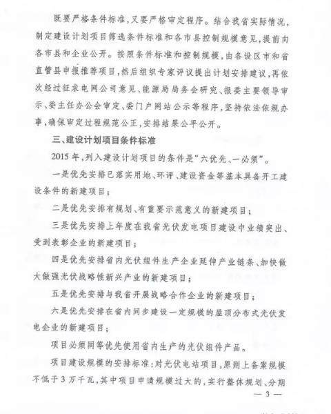 5月22日,河北省發(fā)展和改革委員會下發(fā)《關(guān)于下達(dá)2015年光伏發(fā)電建設(shè)計劃的通知》,翼發(fā)改能源【2015】504號文件。 通知指出,2015年河北光伏項目總體上堅持“三個原則”,既要鼓勵多上快干,又要把握適度有序。大力發(fā)展光伏發(fā)電,河北省有較好的產(chǎn)業(yè)基礎(chǔ)和資源條件