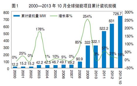 過去三十年,中國經歷了高速的經濟發(fā)展,但也付出了沉重的環(huán)境代價,能源轉型迫在眉睫。加快能源結構調整,增加清潔能源供應已經被提升到國家戰(zhàn)略層面。 儲能產業(yè)作為能源結構調整的支撐產業(yè)和關鍵推手,在傳統(tǒng)發(fā)電、輸配電、電力需求側、輔助服務、新能源接入等不同領域有著廣闊的應用前景。本文將立足于2013年儲能產業(yè)的發(fā)展狀況,對儲能技術熱點應用領域及相關政策進行盤點分析,以期為讀者關注和了解儲能產業(yè)發(fā)展趨勢提供借鑒。 2013年儲能產業(yè)回顧 作為新興產業(yè),儲能在2008年之后一直保持較快增長(圖1),據(jù)中關村儲能產業(yè)技術聯(lián)盟(China Energy Storage Alliance,CNESA)項目庫不完全統(tǒng)計,全球儲能項目在電力系統(tǒng)的裝機總量已經從2008年的不足100MW發(fā)展到2013年10月的726.7MW(不包含抽水蓄能、壓縮空氣儲能及儲熱),年復合增長率(CAGR)達到193%。從地域分布上看,無論是項目數(shù)量還是裝機規(guī)模,美國都占據(jù)領先地位,裝機比重占全球的45%。從技術分類上看,鈉硫電池的裝機比重最大,為46%;鋰離子電池則是應用領域最廣的儲能技術。從應用分類上看,儲能技術較多地應用于風電場、光伏電站及分布式發(fā)電和微網領域。