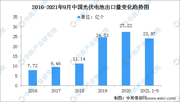 市場現(xiàn)狀1、光伏電池產(chǎn)量數(shù)據(jù)顯示,我國光伏電池產(chǎn)量由2016年7681.0萬千瓦增至2020年15728.6萬千瓦。2021年1-9月我國光伏電池產(chǎn)量達16532.7萬千瓦,同比增長51.8%。數(shù)據(jù)來源:國家統(tǒng)計局、中商產(chǎn)業(yè)研究院整理2、光伏電池出口情況數(shù)據(jù)顯示,我國光伏電池出口量由2016年7.72億個增至2020年27.22億個。