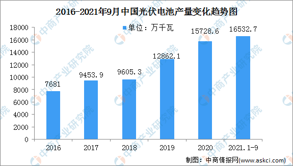 市場現(xiàn)狀 1、光伏電池產(chǎn)量 數(shù)據(jù)顯示,我國光伏電池產(chǎn)量由2016年7681.0萬千瓦增至2020年15728.6萬千瓦。2021年1-9月我國光伏電池產(chǎn)量達16532.7萬千瓦,同比增長51.8%。 ![]() 數(shù)據(jù)來源:國家統(tǒng)計局、中商產(chǎn)業(yè)研究院整理 2、光伏電池出口情況 數(shù)據(jù)顯示,我國光伏電池出口量由2016年7.72億個增至2020年27.22億個。2021年1-9月份出口量達23.97億個,同比增長13.7%。出口金額由2016年745.21萬億元增至2020年1370.05萬億元,2021年1-9月出口金額達1285.2萬億元,同比增長26.6%。 ![]() 數(shù)據(jù)來源:中國海關(guān)、中商產(chǎn)業(yè)研究院整理 ![]() 數(shù)據(jù)來源:中國海關(guān)、中商產(chǎn)業(yè)研究院整理 發(fā)展前景 1、國家政策支持行業(yè)發(fā)展 未來十年,我國能源結(jié)構(gòu)清潔化、低碳化轉(zhuǎn)型的力度將進一步加大,我國推出多項政策,大力支持太陽能光伏產(chǎn)業(yè)建設(shè)。為行業(yè)快速發(fā)展提供了有力的政策支持,營造了寬松有利的發(fā)展環(huán)境,對指導行業(yè)發(fā)展方向、引導市場資源傾斜、提升行業(yè)關(guān)注水平起到了重要作用。 2、平價上網(wǎng)帶動行業(yè)升級 隨著技術(shù)進步和市場需求的雙重驅(qū)動,我國光伏產(chǎn)品的生產(chǎn)成本和發(fā)電成本也在不斷降低。目前光伏電池、組件如大硅片、PERC+及雙面等技術(shù)的發(fā)展,將有效提升組件產(chǎn)品功率及發(fā)電效率,跟蹤支架應(yīng)用、運維能力的持續(xù)提高都將進一步降低光伏發(fā)電系統(tǒng)成本。同時在政策上,合理性的平價項目數(shù)量規(guī)劃、優(yōu)化項目布局保證消納、提升技術(shù)管理能力和增強電力系統(tǒng)靈活性都將進一步推動我國光伏電池行業(yè)可持續(xù)發(fā)展。 3、“一帶一路”戰(zhàn)略助力行業(yè)發(fā)展 一帶一路國家發(fā)展戰(zhàn)略將進一步促進全球太陽能光伏發(fā)電市場繁榮,吸引我國光伏組件、晶體硅電池等向海外市場拓展,帶動光伏電池行業(yè)快速發(fā)展。