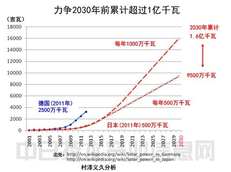 如前文所述,日本的太陽能發(fā)電需要盡快實現(xiàn)每年裝機500萬千瓦,從長期來看,需要每年裝機1000萬千瓦。德國連續(xù)3年每年裝機700萬千瓦以上,從這個角度考慮,日本每年裝機500萬~1000萬千瓦也是有可能實現(xiàn)的。