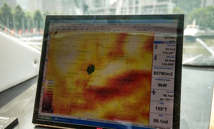 屏幕上所顯示的是未來三天的云量分布預(yù)測(cè)圖。太陽(yáng)光對(duì)于PlanetSolar來說是至關(guān)重要的,所以出航時(shí)盡量避開多云的區(qū)域。