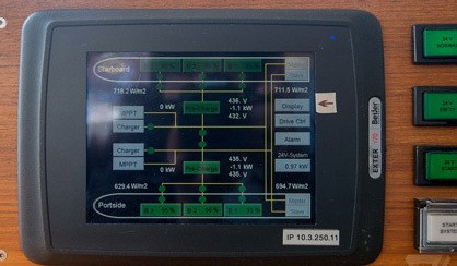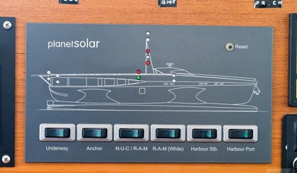 PlanetSolar上的鋰離子電池總重為8.5噸,需要兩天時(shí)間才能充滿電,但充滿電之后能在沒(méi)有陽(yáng)光的情況下保證游艇3天的正常航行。PlanetSolar的外部照明控制面板。