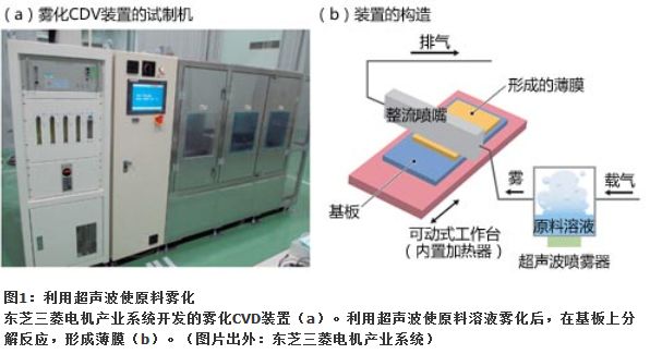 TMmist大致由(1)將原料制成霧狀的超聲波噴霧器、(2)向生產(chǎn)線上流過(guò)的寬1m左右的基板供應(yīng)霧狀原料的細(xì)長(zhǎng)整流噴嘴、(3)加熱基板的加熱器等構(gòu)成(圖1)。