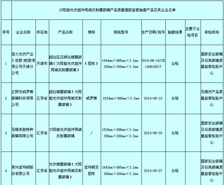 國家質(zhì)檢總局10月29日公布了2014年第3季度太陽能光伏組件用減反射膜玻璃產(chǎn)品質(zhì)量國家監(jiān)督抽查結(jié)果。本次抽查了30家企業(yè)的30種產(chǎn)品,有23家企業(yè)的23種產(chǎn)品合格,抽查企業(yè)合格率和產(chǎn)品合格率均為76.7%。 高效、合理利用可再生能源,實(shí)現(xiàn)全球可持續(xù)發(fā)展已成為各國政府及組