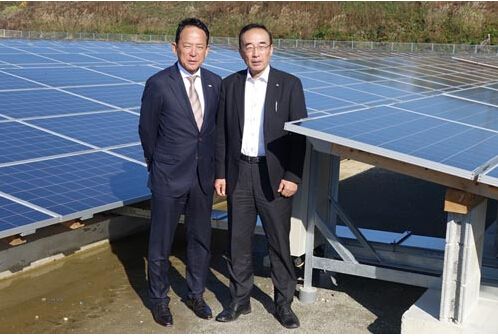愛(ài)德克代表董事會(huì)長(zhǎng)兼社長(zhǎng)舩木俊之(左)與佐用町町長(zhǎng)庵逧典章(右)