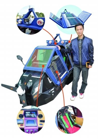 51歲的無(wú)錫“牛人”陸新田,最近造了一輛“神車”。車外形看著和飛機(jī)相似,車頭部有一個(gè)螺旋槳,還有一對(duì)用太陽(yáng)能板組成的車翼,駕駛室內(nèi)沒(méi)有方向盤,只有2個(gè)操縱桿。車上裝有4個(gè)攝像頭,9個(gè)雷達(dá),渾身披著太陽(yáng)能板的外衣。時(shí)速最快能達(dá)到60公里左右,最遠(yuǎn)能開(kāi)60公里。造車用了三年構(gòu)思,三