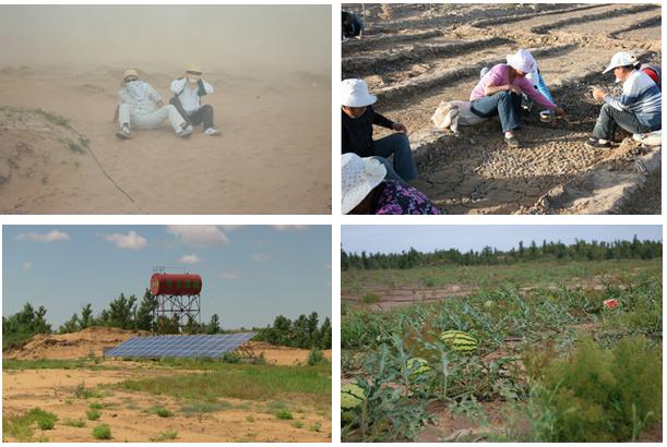 全國(guó)首例光伏水利扶貧示范工程——牛玉琴光伏揚(yáng)水治沙示范基地 2009年以前的毛烏素沙漠南緣,每年都會(huì)遭遇來(lái)自蒙古和北方荒漠的沙塵暴肆虐。沙塵暴破壞了當(dāng)?shù)氐纳鷳B(tài)環(huán)境。植被破壞,農(nóng)田被掩埋,讓草原和良田變成荒漠,嚴(yán)重影響到人民的生產(chǎn)生活水平和經(jīng)濟(jì)收入。為擺脫沙塵暴帶來(lái)的危害與貧困,人們一直在和沙漠進(jìn)行著斗爭(zhēng),并積極尋找科學(xué),高效,和諧的治沙致富途徑。