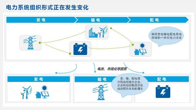 此外,目前電力系統(tǒng)行業(yè)組織形式正在發(fā)生變化,全球電力價值鏈上的企業(yè)和組織數(shù)目正在經(jīng)歷前所未有的增長。曾經(jīng)橫跨發(fā)電輸電配電售電領域的一體化電力企業(yè),因為政府監(jiān)管、市場競爭,電力體制改革等諸多因素而分拆成獨立的發(fā)電企業(yè),輸電企業(yè),配電企業(yè)等細分領域企業(yè)。早在上世紀80年代,英國政府就開始對電力工業(yè)進行改革。1990年,英國政府將英國中央發(fā)電局分解為國家電網(wǎng)公司、3家發(fā)電公司;1996年,美國聯(lián)邦能源管制委員會出臺法令,要求開放電力批發(fā)市場,明確要求發(fā)電廠與電網(wǎng)必須分離;我國也在2002出臺電力體制改革方案,將國家電力公司拆分為兩大電網(wǎng)公司和五大發(fā)電集團,完成“廠網(wǎng)分離”目標,現(xiàn)在中國新的電力體制改革也箭在弦上,改革后,中國電力市場將更加開放,各種類型的企業(yè)都將能夠參與電力市場競爭。