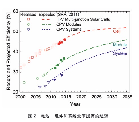 圖2顯示了自2000年以來(lái)芯片、模組和系統(tǒng)效率的提升,強(qiáng)調(diào)了研發(fā)努力的進(jìn)展。這些趨勢(shì)線是來(lái)自歐洲研發(fā)平臺(tái)的預(yù)期,這預(yù)計(jì)了聚光技術(shù)效率提升的巨大潛力。