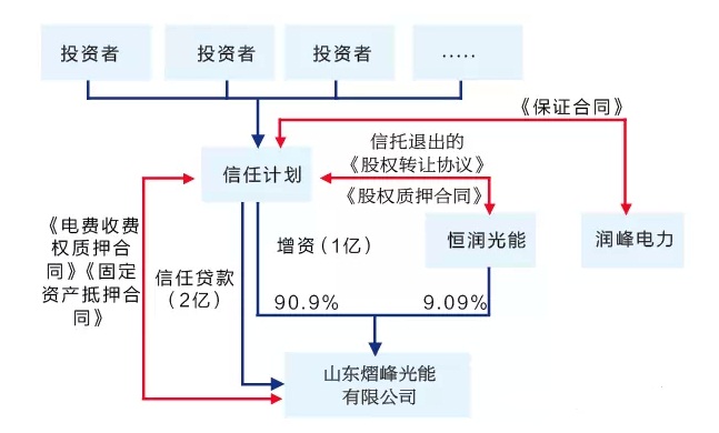 根據(jù)該信托產(chǎn)品計劃說明書,該信托計劃募集總規(guī)模為30,000萬元,其中10,000萬元將用于對山東熠峰光能有限公司(“山東熠峰”)的股權(quán)增資,持股比比為90.91%;20,000萬元用于向山東熠峰發(fā)放信托貸款。項目協(xié)議安排中,為確保信托計劃股權(quán)投資的到期退出機制,英大國際信托與山東熠峰另一股東恒潤光能及其控制人簽署《股權(quán)轉(zhuǎn)讓協(xié)議》;為確保信托貸款的安全,英大國際信托與恒潤光能簽署《股權(quán)質(zhì)押合同》,后者將其持有山東熠峰之股權(quán)質(zhì)押給英大國際信托,此外英大國際信托與借款人山東熠峰簽署《電費收費權(quán)質(zhì)押合同》及《固定資產(chǎn)抵押合同》,后者將項目電費收費權(quán)以及電站主要資產(chǎn)質(zhì)押及抵押給英大國際信托,借款人同時安排潤峰電力有限公司及其控制人與貸款人簽署《保證合同》,就借款人還款義務(wù)的履行提供連帶責(zé)任擔(dān)保。