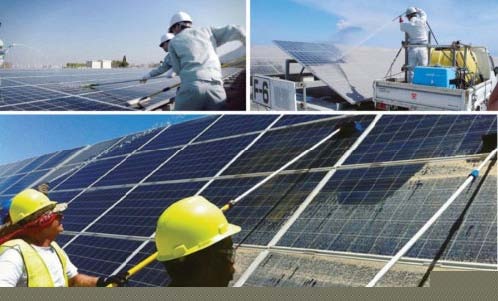 在百萬光伏電站等設(shè)置大量電池板的光伏電站,清潔電池板的主流方式是使用高壓清潔機和人工刷洗(圖6)。