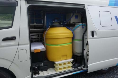 圖8:在運(yùn)輸車內(nèi)制備純凈水,利用水管向機(jī)器人輸送大廈管理的經(jīng)驗(yàn)還運(yùn)用到了在光伏電站附近確保供水點(diǎn)(攝影:日經(jīng)BP社)