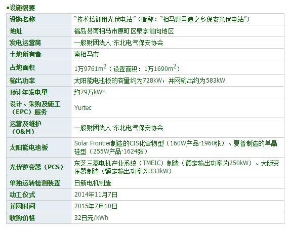 福島縣提出了2040年前后,使縣內(nèi)全部能源需求100%用可再生能源滿足的愿景。為實現(xiàn)這一目標(biāo),在南相馬市的重建計劃中,正在沿海地區(qū)的海嘯災(zāi)區(qū)推進100MW規(guī)模的百萬光伏電站建設(shè)。東北電氣保安協(xié)會的“保安光伏電站”也是租賃南相馬市土地建設(shè)的,在該市的重建計劃中定位為“技術(shù)培訓(xùn)用光伏發(fā)電業(yè)務(wù)”。