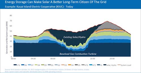這里重要的是夏威夷州的電力的三種特殊情況。首先,該州的用電高峰為傍晚5點(diǎn)~晚上10點(diǎn),而光伏發(fā)電的輸出高峰則是在白天,因此輸出和需求不匹配。其次,隨著光伏發(fā)電的大規(guī)模導(dǎo)入,該州有些地方白天的最小電力需求會(huì)超過發(fā)電量,導(dǎo)致供電系統(tǒng)出現(xiàn)問題。最后,由島嶼構(gòu)成的夏威夷,島上的供電主要依賴進(jìn)口石油,石油火力發(fā)電的比例超過70%。尤其是考艾島的電力公司,化石燃料的成本達(dá)總收入的48%以上,化石燃料的削減成為一大課題。