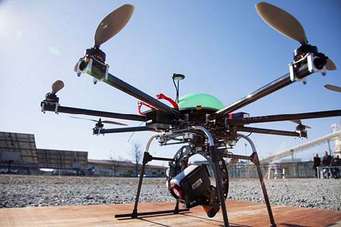 圖6:配備數(shù)碼相機、采用4個螺旋槳的四軸飛行器長95cm,高45cm,重3.75kg,總重量為5.4kg,利用兩塊鋰離子蓄電池可以飛行15~