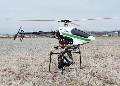 圖7:電動式直升機長150cm,高71cm,重5.0kg,總重量為8.5kg,利用兩塊鋰離子蓄電池可以飛行20~25分鐘(攝影:北海道電氣保安協(xié)會)