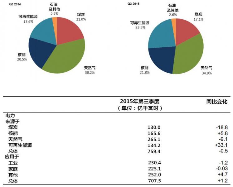 英國2015年第三季度主要電力生產(chǎn)同比提高了12.1%。其中,核電發(fā)電占比增長(zhǎng)5.8%,同時(shí),得益于更高風(fēng)速、更大的風(fēng)電和太陽能裝機(jī)容量以及18.4%的降水增長(zhǎng),風(fēng)能、太陽能和水能發(fā)電同比提高了46%。