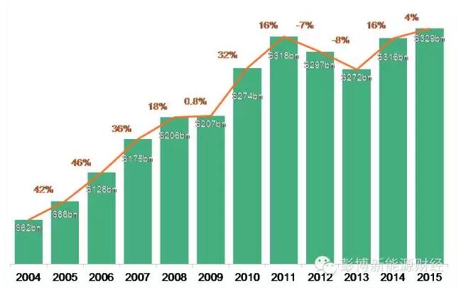 備注:為了反映更多交易信息,我們對(duì)歷史年度投資總額進(jìn)行了適當(dāng)修訂。彭博新能源財(cái)經(jīng)得到的最新全球清潔能源歷史投資數(shù)據(jù)如下所示:2004年619億美元;2005年880億美元;2006年1283億美元;2007年1749億美元;2008年2056億美元;2009年2073億美元;2010年2737億美元;2011年3183億美元;2012年2970億美元;2013年2719億美元;2014年3159億美元;2015年3289億美元。