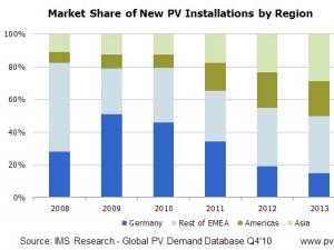 預(yù)計2010年德國光伏市場的份額將下降至46%,2011年將繼續(xù)降低至35%以下,之后并將持續(xù)穩(wěn)步回落。相反美國和亞洲市場份額預(yù)計在今后5年將不斷爬升,這些地區(qū)將成為光伏產(chǎn)業(yè)的主要驅(qū)動力。展望2011年以后,IMS Research預(yù)計,至少未來4年,新增光伏容量將超過100GW。