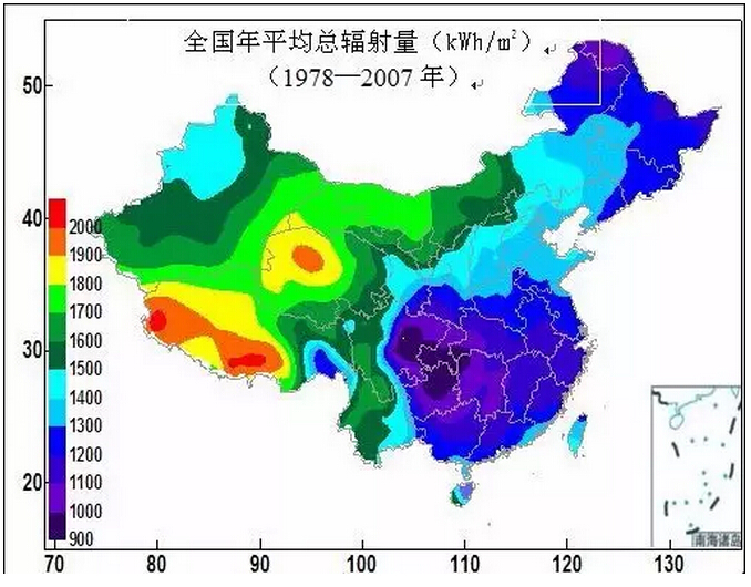 結(jié)合中國氣象局中國1978~2007年平均的總輻射年總量空間分布(kWh˙m-2)可以更加直觀的顯示出我國資源的分布情況。
