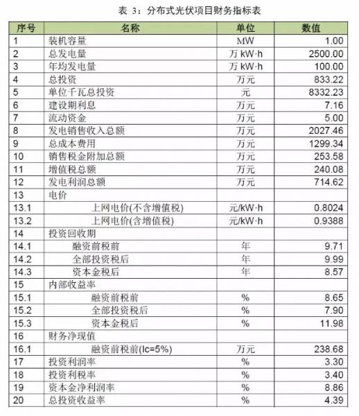 表3 分布式光伏項(xiàng)目財(cái)務(wù)指標(biāo)表