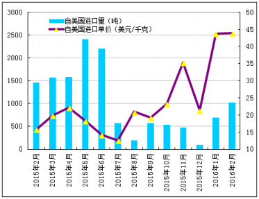 美國: 2016年2月份從美國進口多晶硅量為1017噸,環(huán)比增加47.4%;2月份進口單價創(chuàng)新高上漲至43.83美元/千克,環(huán)比增幅為0.37%。