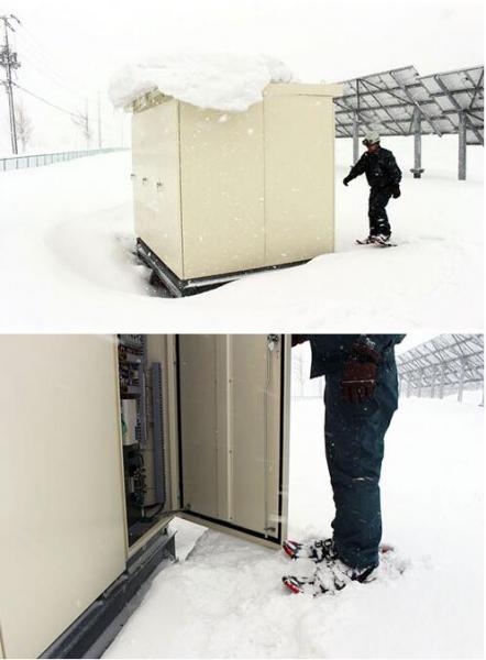 北海道電氣保安協(xié)會表示,在積雪量比巖見澤大的俱知安町和巖內(nèi)町等地的光伏電站檢查時,有升壓變壓器和PCS機殼被埋在雪中的時候。這時就要用鐵鍬挖開機殼門附近的雪。