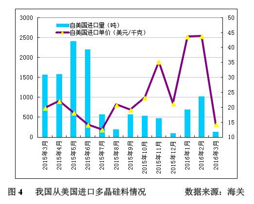 年3月份從美國(guó)進(jìn)口多晶硅量為140噸,環(huán)比大幅減少86.2%;3月份進(jìn)口單價(jià)大幅下跌至14.38美元/千克,環(huán)比降幅為67.2%。2016年一季