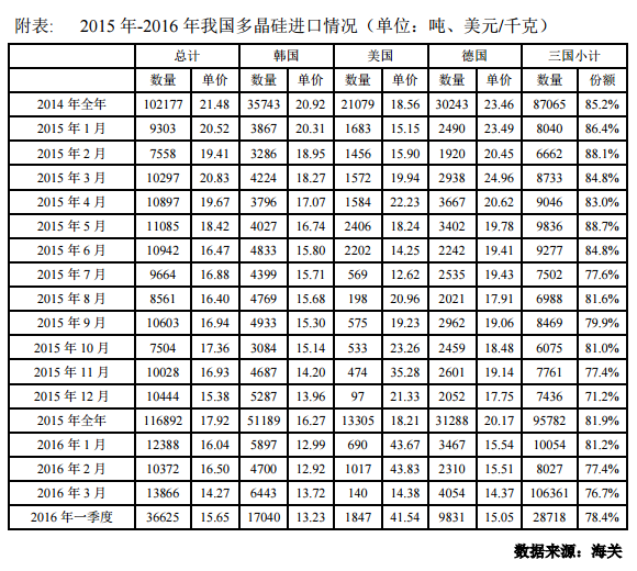 7.4%。2016年一季度從德國(guó)累計(jì)進(jìn)口多晶硅量為9831噸,同比增加33.8%;累計(jì)進(jìn)口均價(jià)為15.05美元/千克,同比下滑35.4%。