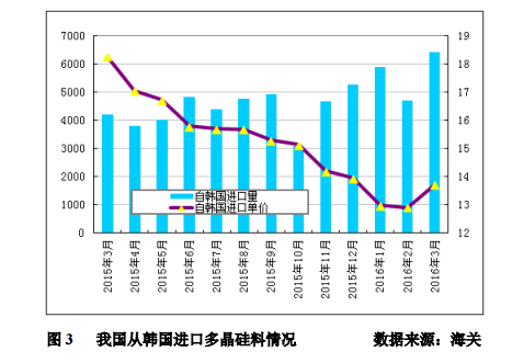 進(jìn)口多晶硅量再創(chuàng)歷史新高至6443噸,環(huán)比增加37.1%;進(jìn)口單價(jià)微幅回升至13.72美元/千克,環(huán)比上漲為6.2%。2016年一季度從韓國(guó)累計(jì)