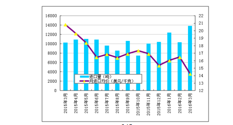 圖1 2015年3月-2016年3月多晶硅進口量及進口均價示意圖 數(shù)據(jù)來源:海關