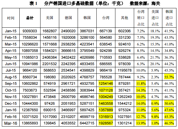 二、3月份從韓國進口多晶硅量為6443噸,再創(chuàng)歷史新高,環(huán)比增加37.1%,在當月總進量中的占比仍高達46.5%,一季度累計進口量為17040噸,同比增加49.8%。3月份自韓國按加工貿易方式進口多晶硅434噸,占自韓國進口總量的6.7%,較之前50%左右的加工貿易占比有大幅降低,主要仍是由于韓國的主要出口企業(yè)OCI和韓國硅業(yè)(HankookSilicon)的稅率僅為2.4%和2.8%,反傾銷稅對其根本不造成任何影響,故均滿產運行,照舊出口中國,其他稅率稍高的企業(yè)則通過轉口臺灣或加工貿易等方式進入中國。同時,一季度從韓國進口多晶硅均價降至13.23美元/千克,同比大幅下滑30.9%。以上數(shù)據(jù)看出,“雙反”對韓國反傾銷懲罰幅度過于微弱,韓國無論是以一般貿易方式或者加工貿易方式出口到中國,對其都毫無影響,故可以一再壓低價格傾銷?梢姡n國無論從是在進口價格或者進口量方面都嚴重沖擊著國內多晶硅市場,因此對韓國傾銷進行復審應視為重中之重。