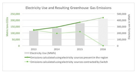 Switch在2015年的電力消費量為35萬1484MWh,排放的二氧化碳達18萬噸以上。2016年,隨著新數據中心投入使用,預測電力消耗量將增加約20%,達到42萬671MWh,但使用NVEnergy的“可再生能源100%”電力計劃,二氧化碳排放量將歸零(圖4)。