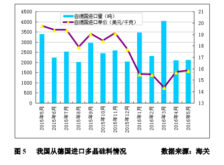 2016年1-5月份從德國累計(jì)進(jìn)口多晶硅量為14065噸,同比減少2.4%;累計(jì)進(jìn)口均價(jià)為15.27美元/千克,同比下滑29.9%。