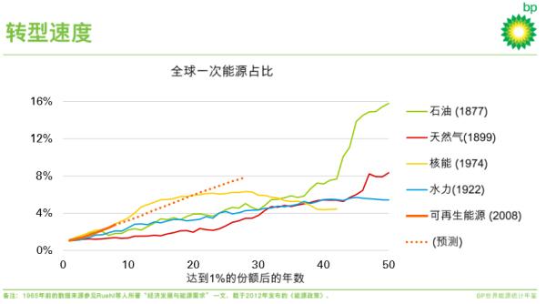 “石油在全球能源市場(chǎng)的比重在1877年達(dá)到了1%,過去50年不斷增加。天然氣達(dá)到1%是在1899年,核能是1974年,可見,這些燃料花了很長(zhǎng)時(shí)間才在全球能源結(jié)構(gòu)中占到可觀的比重。比如石油基本上花了45年,才在全球能源結(jié)構(gòu)中占到10%。即使過了50年,天然氣依然沒有達(dá)到10%的水平。因此,一種新的能源滲透進(jìn)能源市場(chǎng)、占到一定比重,這需要花很長(zhǎng)的時(shí)間。一部分原因是需要很多時(shí)間、很多資源的投入,才能夠使一種新的能源規(guī)模化、達(dá)到可觀的比重。另外,能源產(chǎn)業(yè)是資本密集型的,所以很多設(shè)備、很多投資都有很長(zhǎng)的生命周期,比如發(fā)電設(shè)備有40-50年生命周期,這會(huì)拖累新的能源采納速度。”他說,根據(jù)BP全球能源預(yù)測(cè)報(bào)告,可再生能源的發(fā)展會(huì)比歷史上任何一種能源在任何一個(gè)階段的增長(zhǎng)都更迅猛,但即便如此,可再生能源的比重到2035年也不會(huì)達(dá)到10%,真正滲透到能源市場(chǎng)需要很漫長(zhǎng)的時(shí)間。