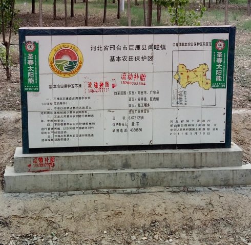 記者調(diào)查發(fā)現(xiàn),大棚光電一期占地1700畝(規(guī)劃總占地3500余畝),共涉及巨鹿縣閻疃鎮(zhèn)黃家屯村、宋莊村、馬莊村、王莊村、張王疃鄉(xiāng)洪水口村等5個村莊、約4000戶村民。沿著324省道向東行駛到61公里處,在被征土地大棚光電一期的廠區(qū)附近,記者看到了由當(dāng)?shù)貒敛块T制作的基本農(nóng)田保護區(qū)水泥標(biāo)示牌,清晰標(biāo)明了該項目所占土地全部為基本農(nóng)田。
