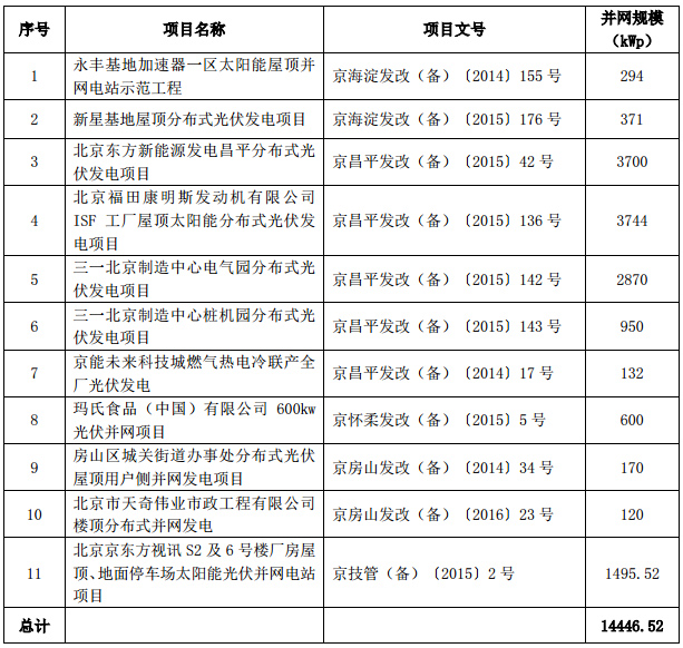 《北京市分布式光伏項目獎勵名單