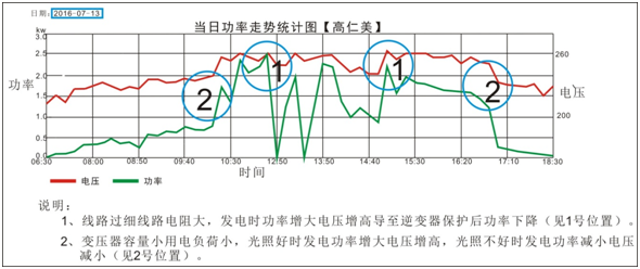 2.發(fā)電電壓、電量與電網(wǎng)電壓、變壓器容量失配,日光輻射沒有得到有效利用而棄光。當(dāng)電網(wǎng)電壓不穩(wěn),變壓器容量小,帶來光伏系統(tǒng)電壓失配或容量超限,使逆變器處于“超壓保護(hù)--重新啟動(dòng)”反復(fù)調(diào)整中,甚至停止工作,使光伏系統(tǒng)不能正常發(fā)電或發(fā)電脫網(wǎng),降低了光電轉(zhuǎn)換效率。巫溪縣張啟發(fā)、張世萬等項(xiàng)目戶,均出現(xiàn)電網(wǎng)電壓高于逆變器保護(hù)電壓而發(fā)生棄光現(xiàn)象。如下功率曲線圖所示。