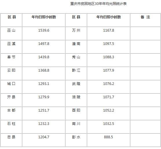 (一)在滿足日照條件的適宜貧困地區(qū)推廣光伏發(fā)電扶貧。我市屬太陽能Ⅲ類資源區(qū),光照資源總體上渝東好、渝西差,貧困山區(qū)好于主城區(qū),據市氣象局統(tǒng)計30年日照情況(見下表),巫山等9個貧困區(qū)縣日照達1200至1500小時/年。按8元/w投資成本與發(fā)電收益計算,光伏發(fā)電投入產出比達12%以上,高于農村一般項目收益。目前,重慶光伏發(fā)電裝機不足5兆瓦,僅為全國的0.0065%,與世界清潔能源大國德國達37%比相差甚遠。光伏發(fā)電符合國家清潔低碳能源發(fā)展戰(zhàn)略,我市潛力巨大,尤其是在缺乏穩(wěn)定增收產業(yè),光照資源好的貧困地區(qū),可望建成穩(wěn)定收入來源的村級扶貧產業(yè)。