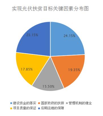 數(shù)據(jù)顯示,24.15%的群眾認(rèn)為影響光伏扶貧目標(biāo)實(shí)現(xiàn)的最重要的因素是建設(shè)資金的落實(shí);23.15%的群眾表示后期運(yùn)維的保障是最關(guān)鍵的方面;另外國家政策的扶持,項(xiàng)目質(zhì)量的保證以及管理機(jī)制的健全也是我國實(shí)現(xiàn)光伏扶貧目標(biāo)的重要因素,分別占比19.35%、17.85%和15.50%。