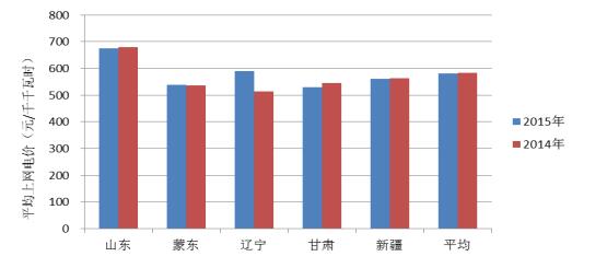 從蒙東、山東、甘肅、遼寧、新疆五個重點(diǎn)省份(地區(qū))看,2015年平均上網(wǎng)電價為580.21元/千千瓦時,同比下降0.66%,其中山東最高,為674.26元/千千瓦時,甘肅最低,為529.78元/千千瓦時。詳見圖2-3。