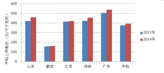 從山東、蒙西、江蘇、河南、廣東五個重點(diǎn)省份看,2015年平均上網(wǎng)電價為376.02元/千千瓦時,同比下降4.34%。其中廣東最高,為504.76元/千千瓦時,蒙西最低,為157.32元/千千瓦時。詳見圖2-1。