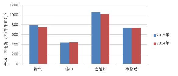 從全國看,2015年燃?xì)獍l(fā)電、太陽能發(fā)電平均上網(wǎng)電價分別為789.82元/千千瓦時、1056.89元/千千瓦時,同比分別增長5.2%、3.99%;核電、生物質(zhì)發(fā)電平均上網(wǎng)電價為434.03元/千千瓦時、732.83元/千千瓦時,同比分別下降0.83%、0.07%。詳見圖2-4。