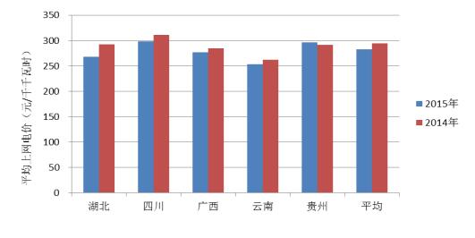 從四川、湖北、云南、貴州、廣西五個重點(diǎn)省份看,2015年平均上網(wǎng)電價為282.15元/千千瓦時,同比下降4.16%,其中四川最高,為298.14元/千千瓦時,云南最低,為252.94元/千千瓦時。詳見圖2-2。
