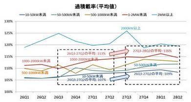 設備利用率方面,與2014年7月~2015年6月和2015年7月~2016年8月相比,10kW以上總體從13.5%增至13.8%;1MW以上從14.6%增至15.1%;1MW以上2MW以下從14.6%增至15.0%;2MW以上從15.2%增至16.3%等,全部都上升了。這些上升的背景是平均過載(設置的電池板容量大于并網(wǎng)輸出功率的設計方法)約為120%。